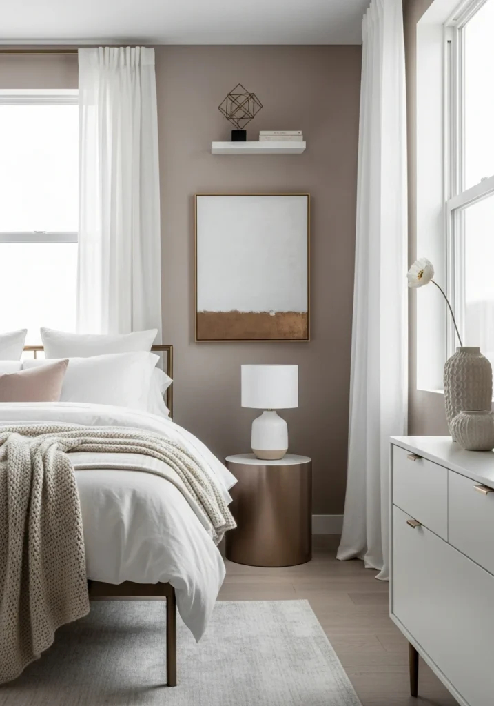 Cool mushroom-toned walls bring organic warmth that frost-white linens balance perfectly. Pale bronze accents add subtle shine that catches light beautifully. Layered bedding creates texture within the restrained palette.