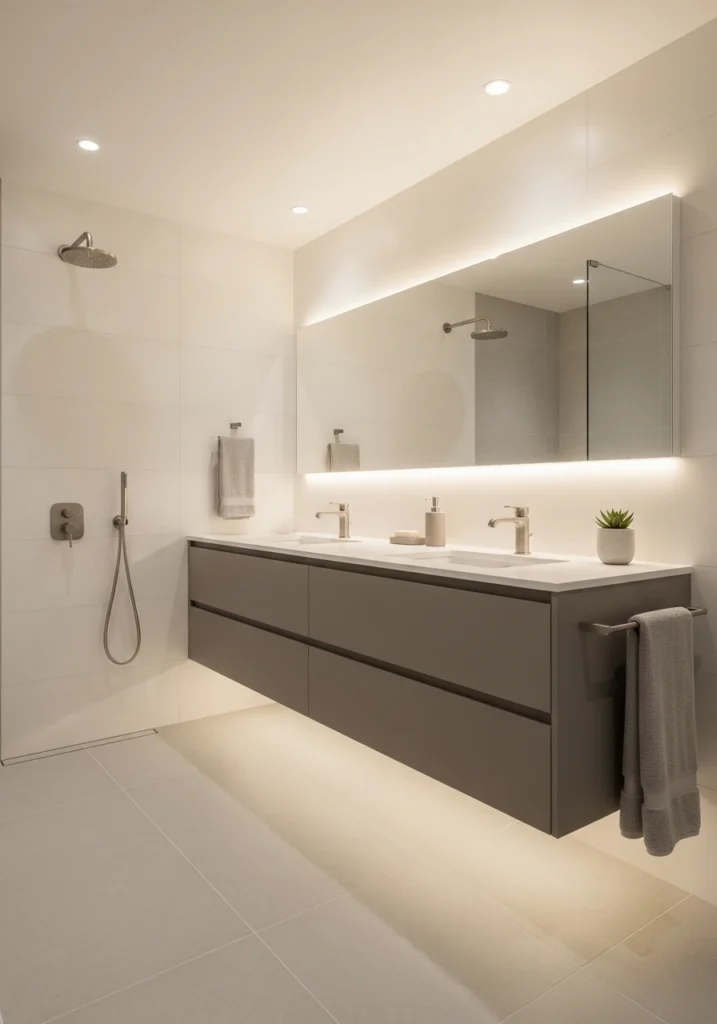 Clean geometry and soft lighting create the spa-like atmosphere. Minimal decor keeps the focus on the materials and finishes. This modern, elevated January palette makes daily routines feel like self-care rituals.