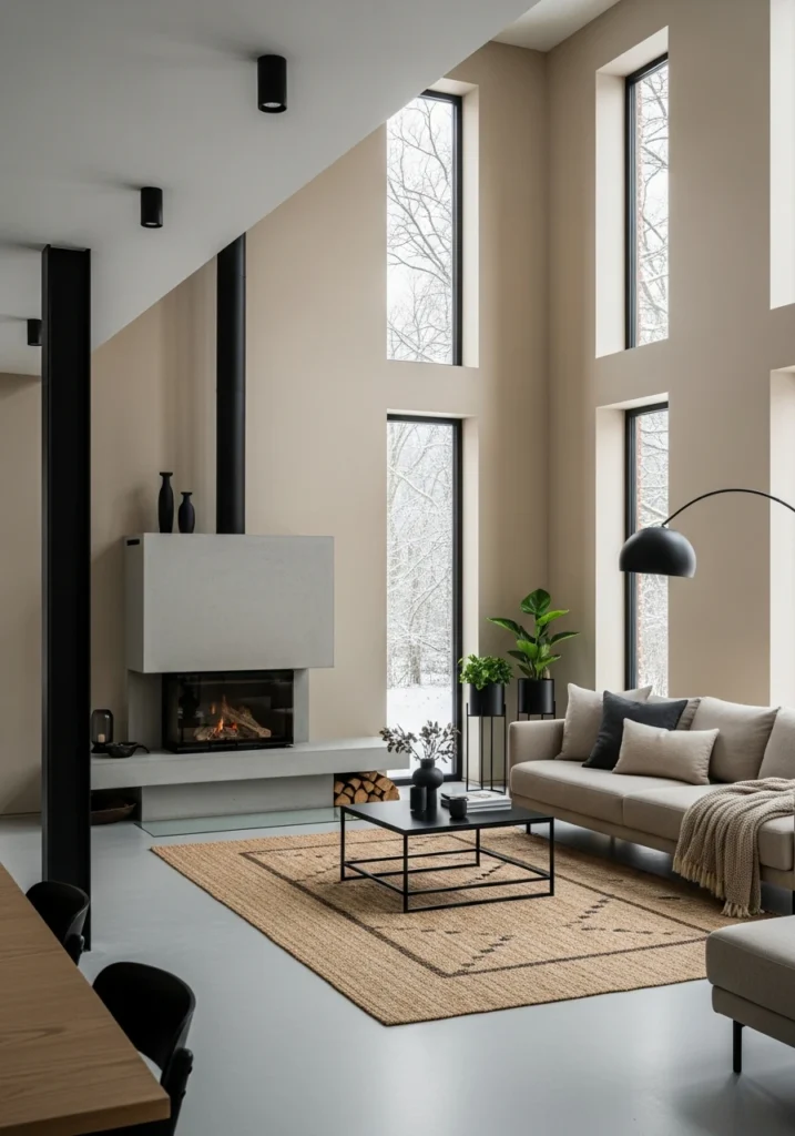 Bold minimalism for open-plan living. Soft sand-toned walls warm up cool concrete flooring beautifully. Graphite-black accents create striking contrast that makes the neutral base feel intentional rather than safe.