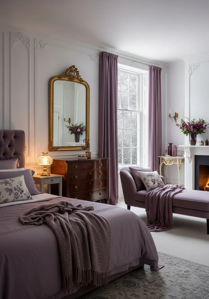 Unexpected richness for January. Pearl-white walls keep things light while muted plum textiles bring that deep, saturated color moment. Antique gold detailing adds warmth and luxury without feeling overdone.