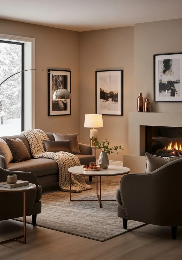 Warm putty walls create this enveloping base for charcoal-brown upholstery to anchor against. Soft copper accents bring that organic metallic warmth. Layered textures throughout add depth.