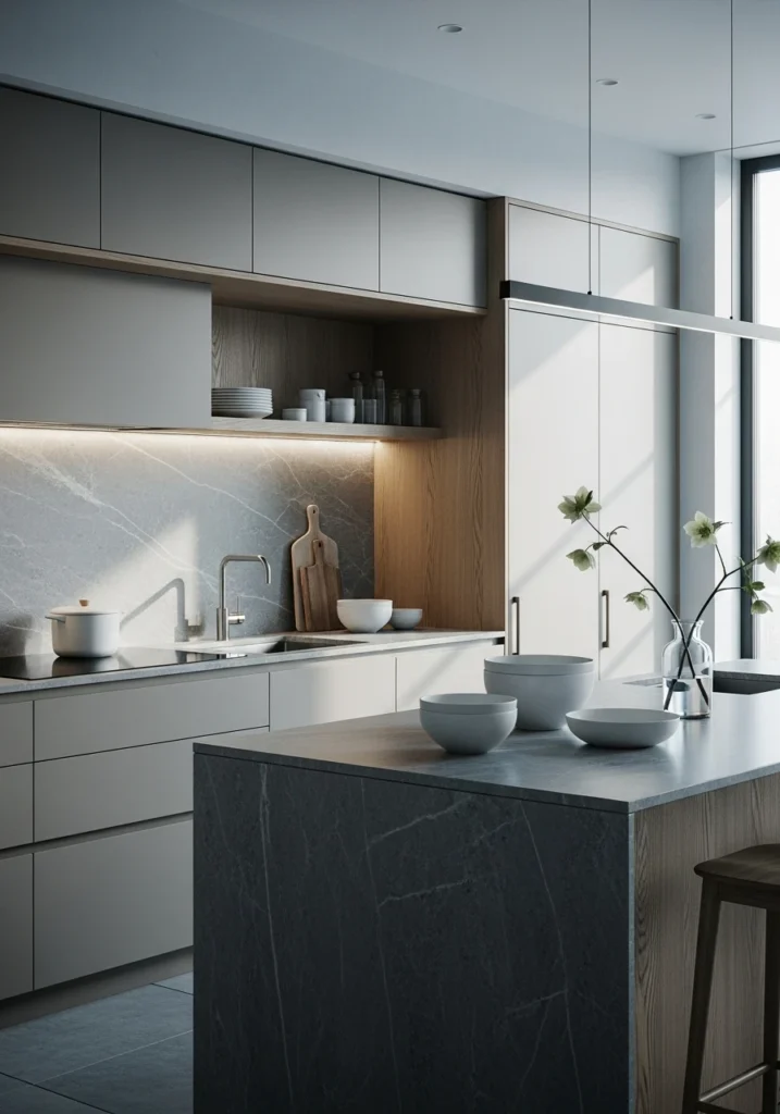 Kitchen perfection in winter tones. Cool taupe cabinetry pairs beautifully with frosted grey stone surfaces. Natural ash wood elements prevent the cool tones from feeling sterile.