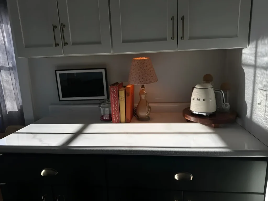 Declare your tiny counter corner the VIP lounge with a custom brass inlay tray, flush with your stone. Arrange matte obsidian candleholders—go for varying heights (short is cowardly!). Cream taper candles plus moody black river stones in a ceramic bowl? Yes, you live for drama. Toss an oversized linen napkin casually nearby, but please, crumple it with purpose. Let a marble backsplash and hidden LEDs bounce the glow for that quiet-money effect. Crucial tip: Don’t actually light all those candles at dinner—you’re going for ambiance, not cooking yourself like a rotisserie chicken.