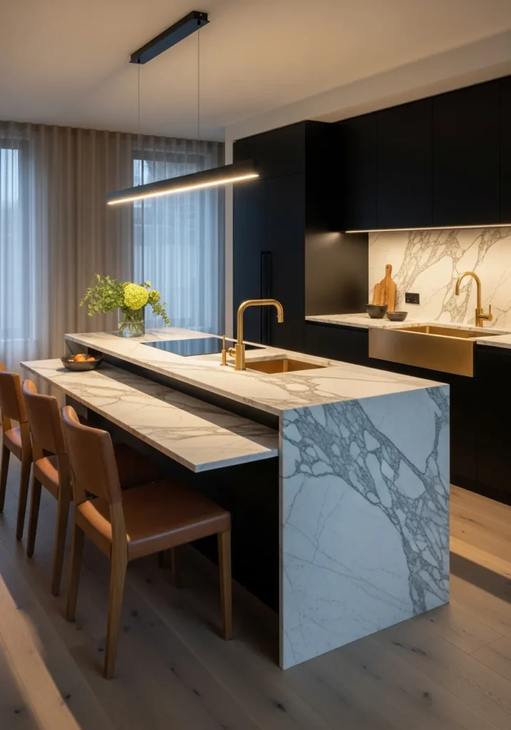 This setup takes the kitchen island concept and stretches it into something truly elegant. The bookmatched Calacatta marble extends from prep space into a slim dining surface, with leather-upholstered chairs tucked right along the cantilever.
