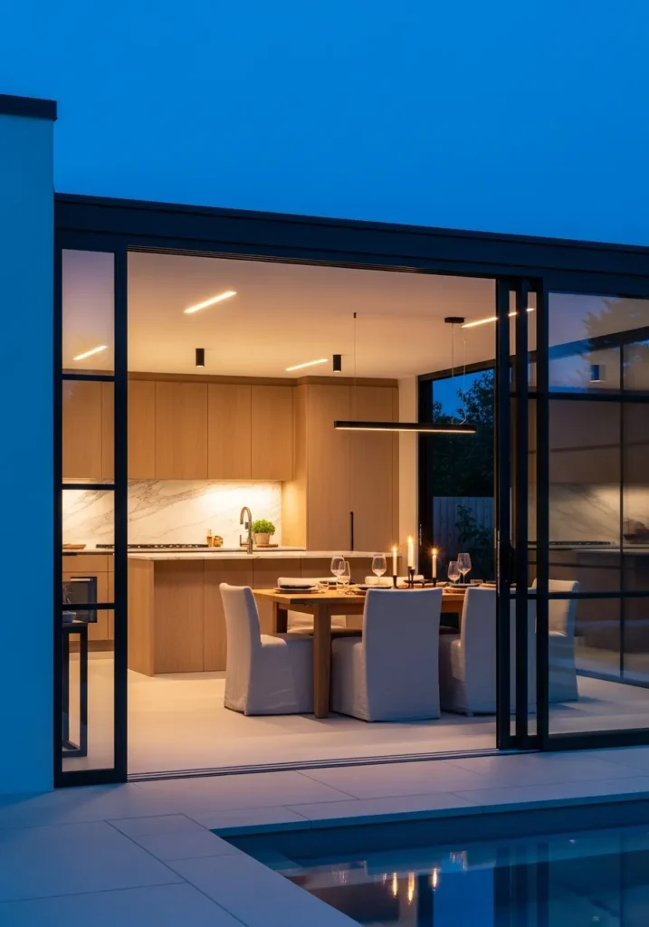 The magic happens at twilight during blue hour, when the warm interior light glows against the darkening sky and the reflective pool edge near the pavilion mirrors everything back. Linear recessed ceiling lights inside provide functional illumination, while the candlelit table setting creates intimacy.