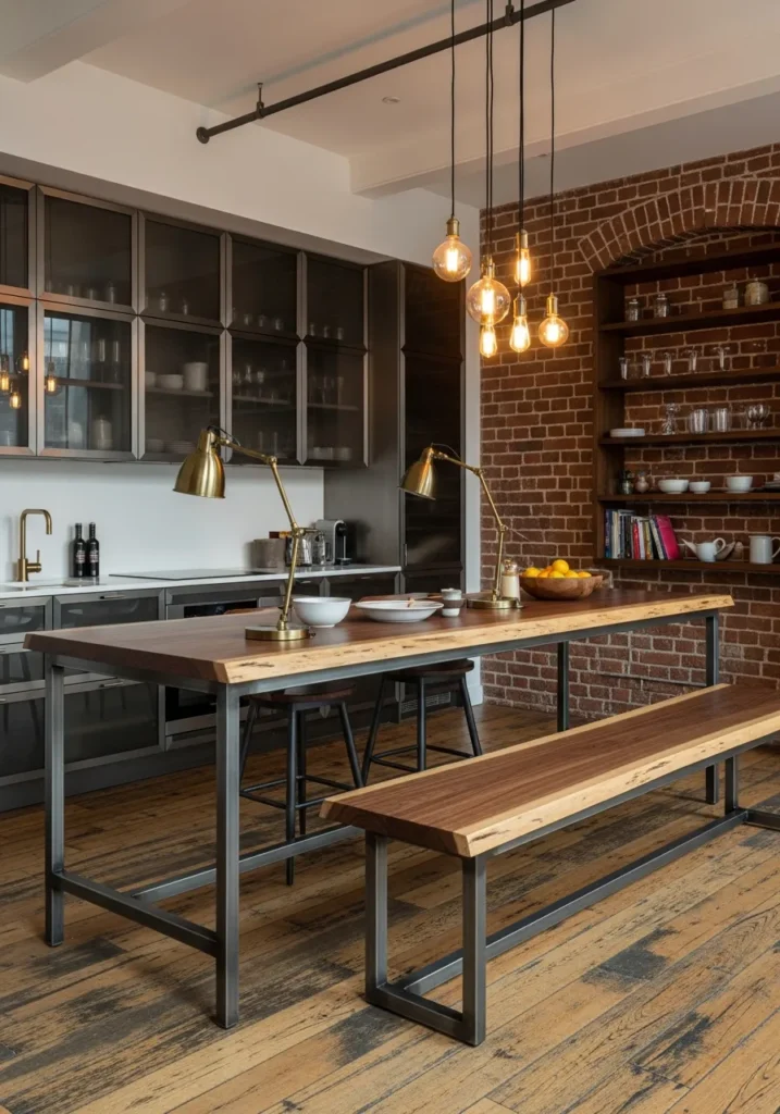Loft living gets the kitchen-dining treatment with this open-plan space that mixes raw materials with refined details. The steel-framed kitchen island features a raw-edge walnut top that extends to create a communal dining bench—one continuous surface that flows from prep to gathering.