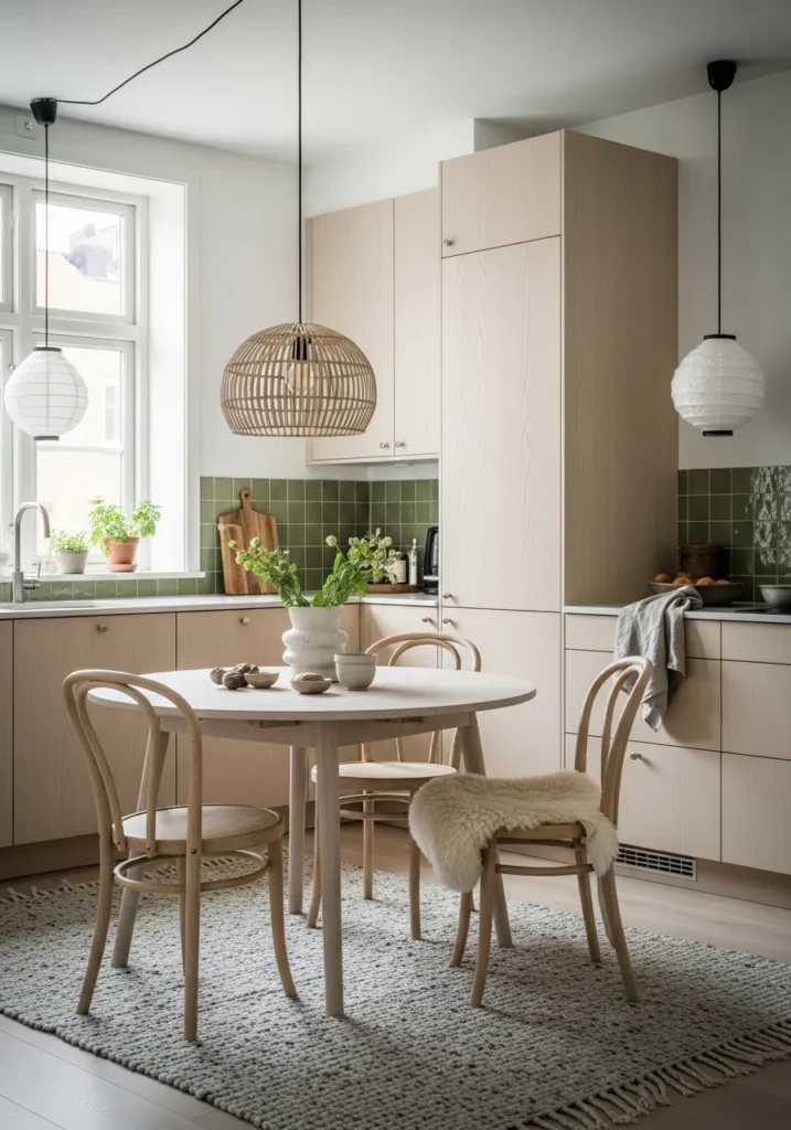 Scandinavian design philosophy shines in this soft, textural space. Pale ash cabinetry with integrated handles keeps surfaces smooth and continuous, while a round bleached-wood dining table with three bentwood chairs creates the dining zone.