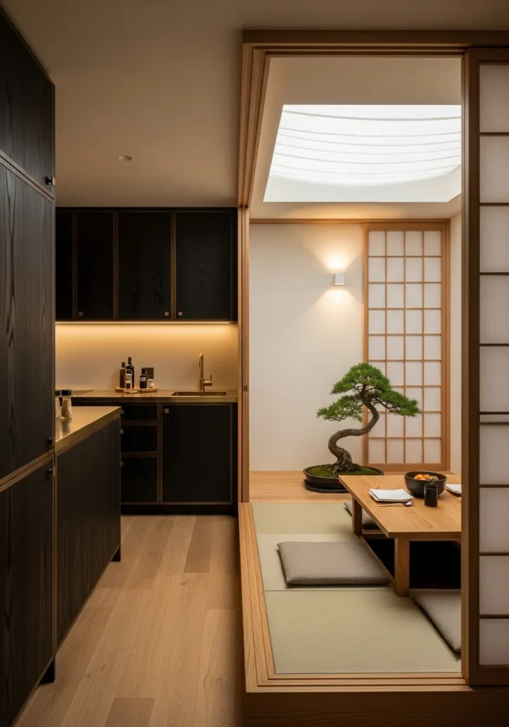 Adjacent to the kitchen sits a shallow recessed tatami-style dining platform with a low oak table and floor cushions. Sliding shoji screens add privacy when needed while maintaining the clean aesthetic. A single sculptural bonsai serves as the centerpiece, embodying that Japanese principle of finding beauty in simplicity.