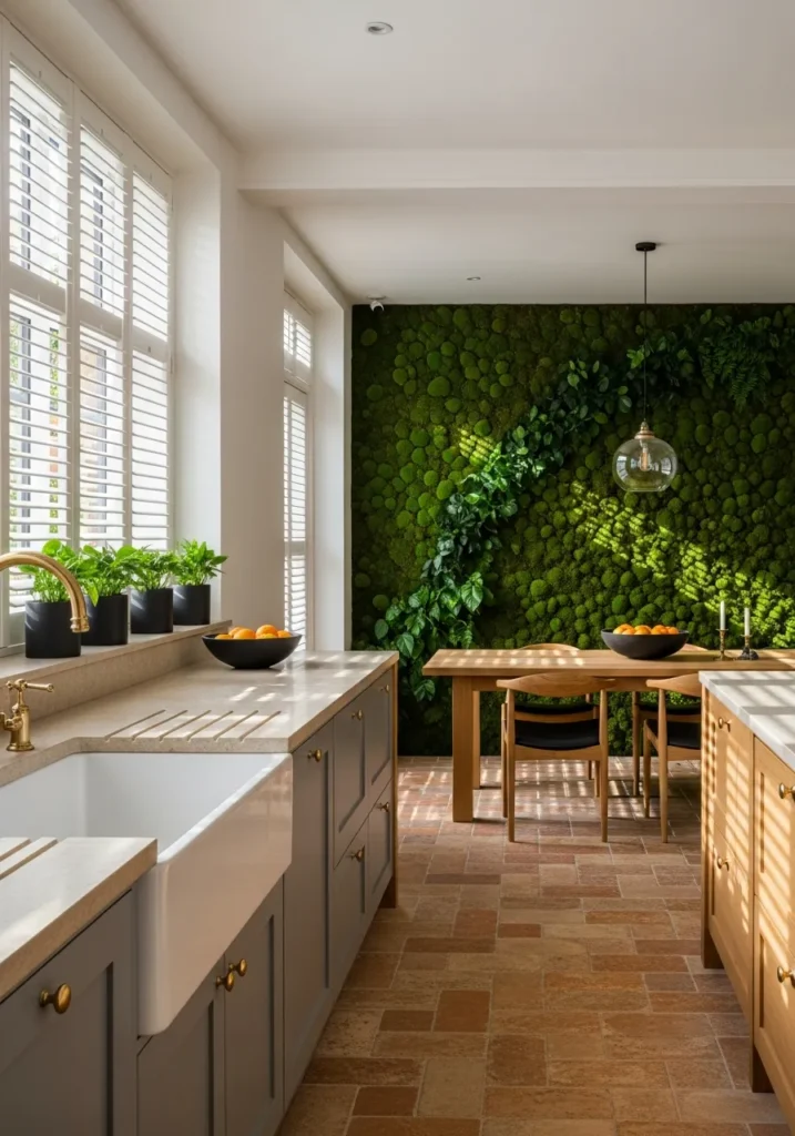 Bringing the outdoors in takes center stage here with a living moss-and-fern green wall serving as the dramatic backdrop to the dining area. The kitchen features light limestone counters that echo natural stone formations, while the central dining table in honeyed oak adds warmth.