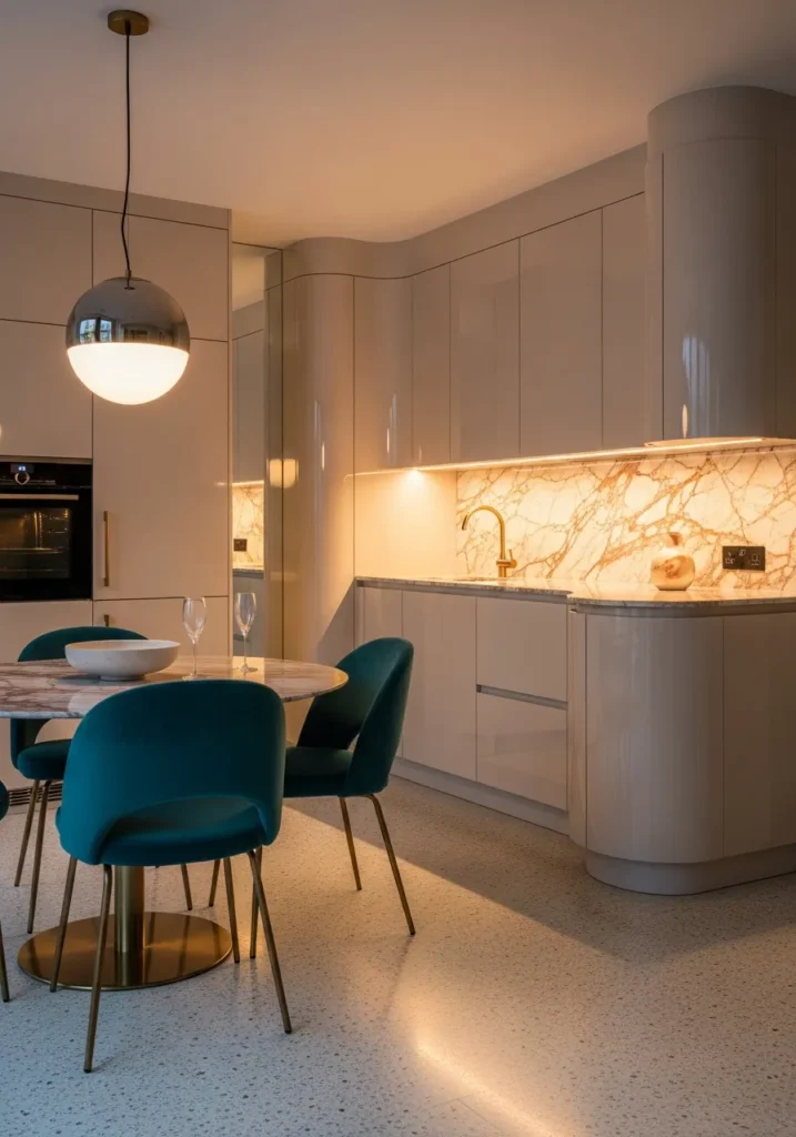 A small round dining table surrounded by deep teal velvet chairs with brass legs brings that vintage glamour without feeling dated. The terrazzo floor with subtle flecks adds pattern and visual interest underfoot.