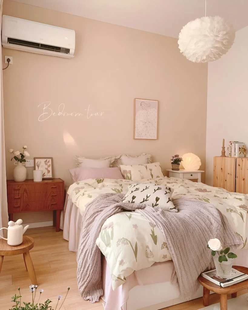 u/Outrageous-Chest8411 shows how moody doesn’t have to mean dark. This soft pink bedroom with botanical print bedding creates romance through color and pattern. That fluffy white pendant light adds texture overhead, while the mid-century nightstand in warm wood grounds everything.