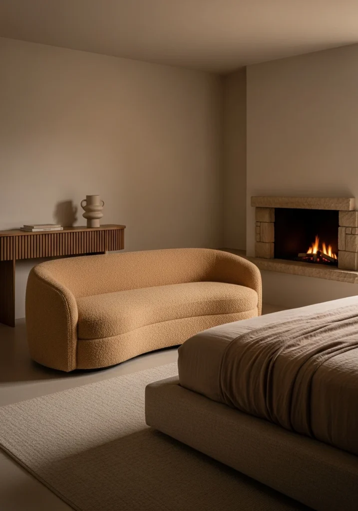 A curved bouclé daybed at center in warm oat provides cozy seating, paired with a platform bed dressed in linen layers in muted clay. A low stone-clad fireplace recessed into the wall casts soft amber glow, while a fluted oak console and single sculptural ceramic vase add organic elements.