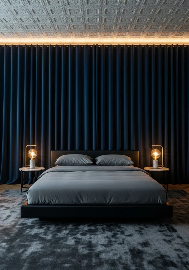 Floor-to-ceiling indigo velvet drapes form a theatrical backdrop for a low ebony platform bed with matte-slate bedding. Slender marble-top side tables hold vintage-inspired brass lamps casting warm glow, while textured plaster ceiling with subtle uplighting adds architectural interest.