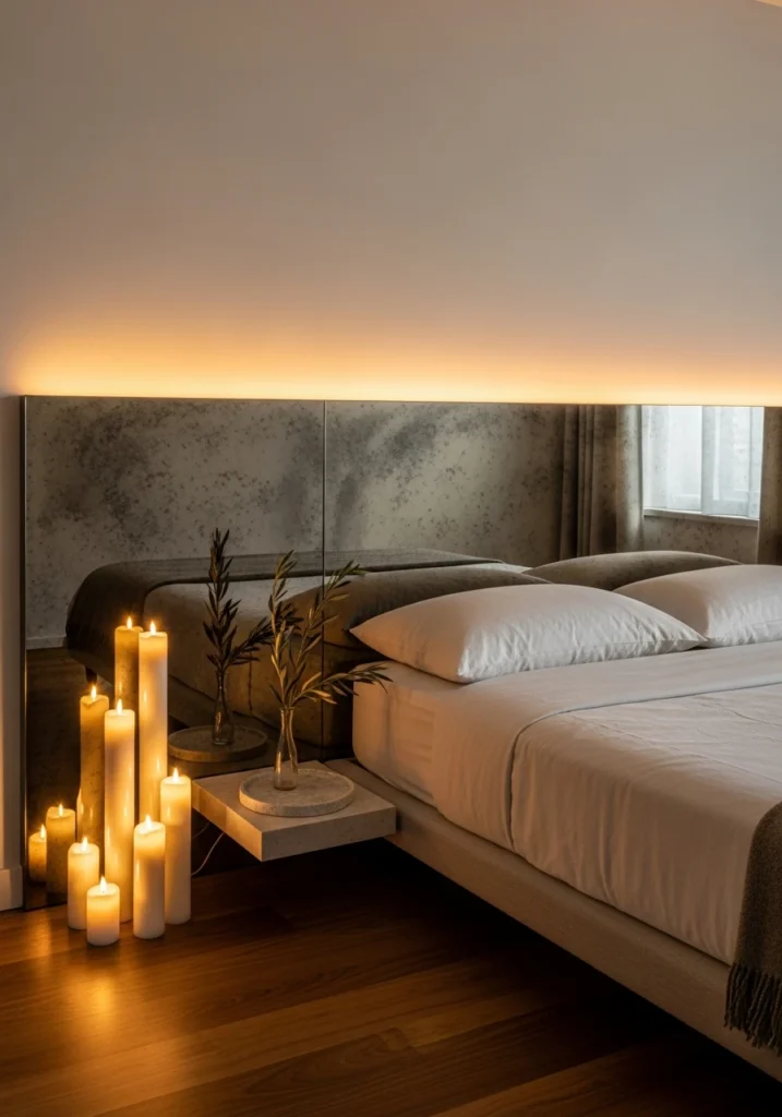 A smoked-antique mirror headboard spanning the wall creates depth and reflection. A low-profile bed in cream linen provides contrast, while a staggered candle ladder with LED candles to one side casts soft reflective points throughout the space.
