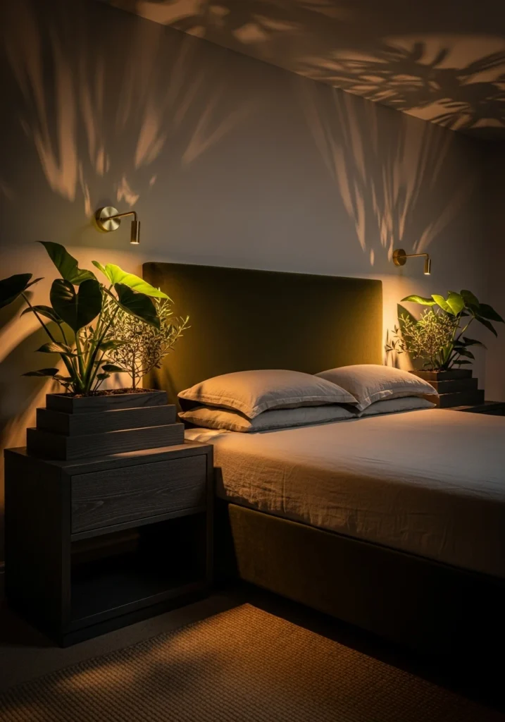 Thin brass reading sconces provide task lighting, while low amber uplighting produces dappled plant shadows on walls and ceiling. A wool rug in warm sand grounds everything—this is moody meets botanical, darkness softened by greenery.