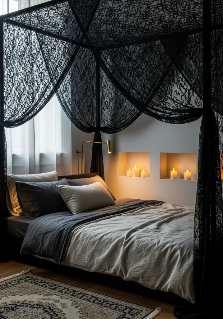 A delicate lace canopy in deep ink drapes over a four-post low bed, creating intimacy within the larger room. Bedding in charcoal and antique-ivory provides tonal contrast, while built-in recessed candle niches with warm LED candles add ambient glow.