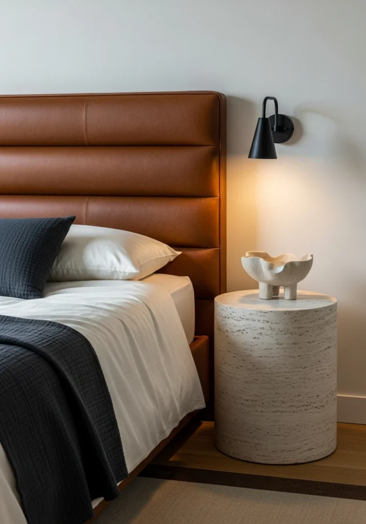 A saddle-leather wrapped headboard with deep horizontal channels creates texture and warmth. Silk-ivory sheets and a dark slate throw provide that masculine-feminine balance, while a circular honed-stone bedside table holds a single sculpted ceramic bowl.