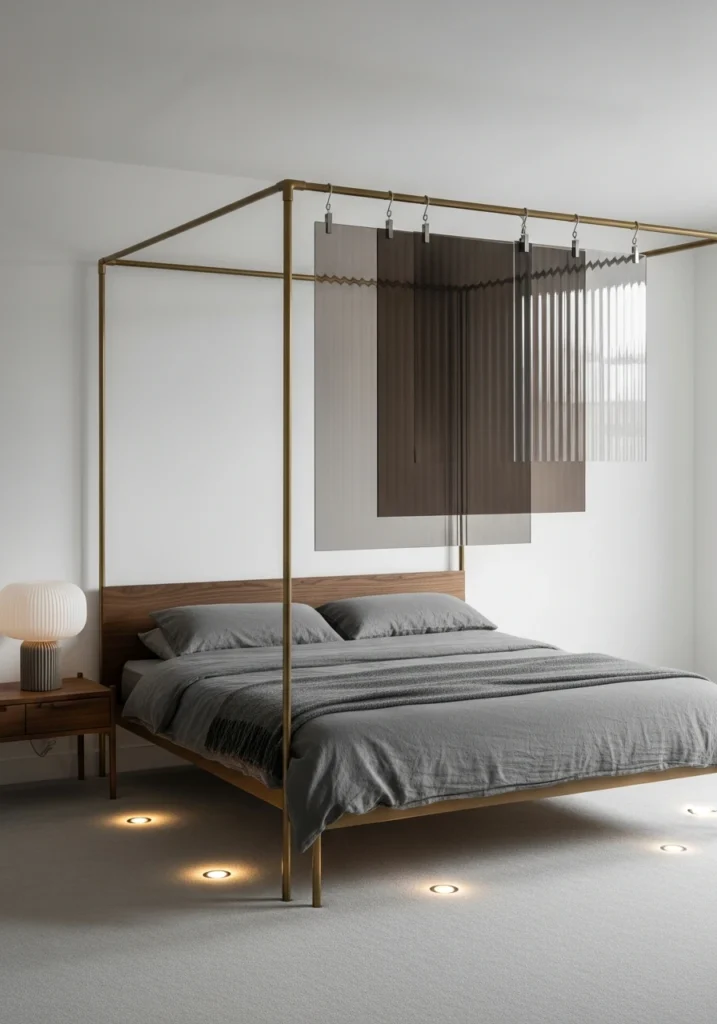 A thin brass canopy frames a low bed with graphite linens, with translucent smoky glass panels hung asymmetrically from the canopy creating layered privacy. A low walnut console with ribbed ceramic lamp provides soft light, while recessed floor uplights create soft silhouette drama.