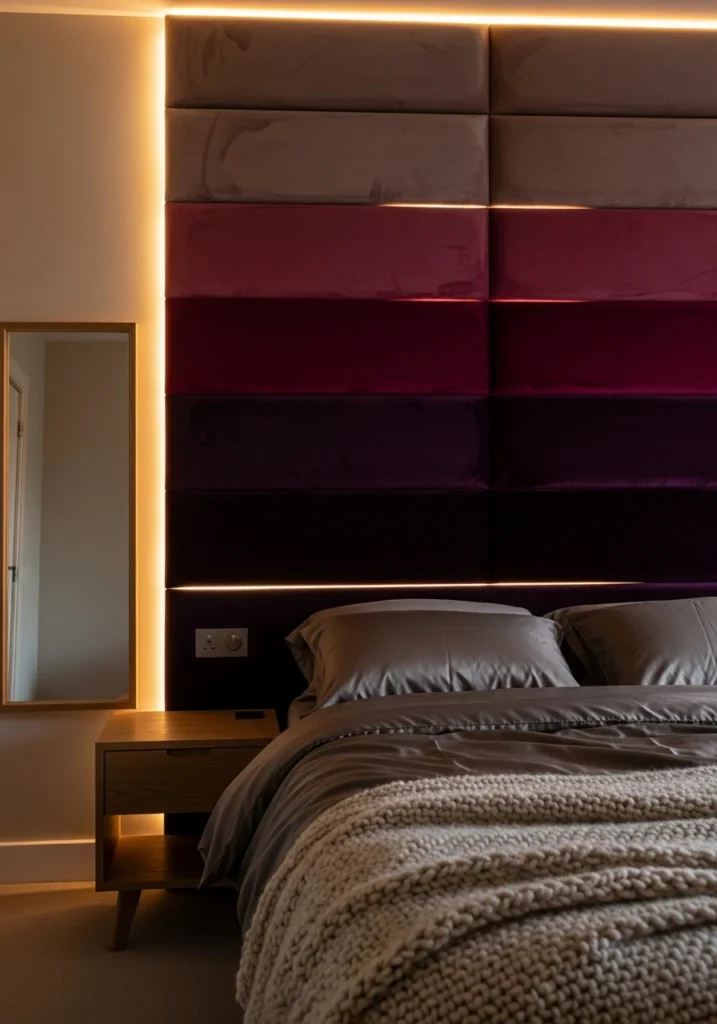 A wall of oversized plush velvet panels in a gradient of deep berry tones sits behind the bed, with integrated hidden LED strips casting soft halos between panels. A low oak bedside with narrow mirror provides function, while silk-satin bedding in deep taupe and a tactile boucle throw add layers.