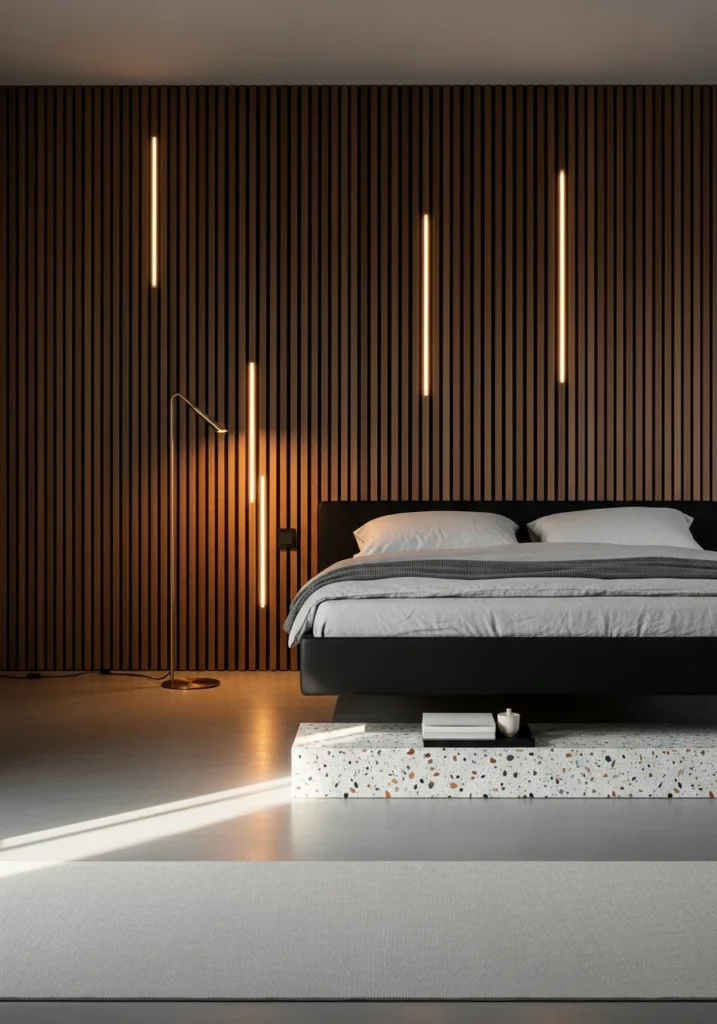 Horizontal smoked-oak slatted feature wall with narrow recessed lighting between slats creates this linear drama. A floating platform bed in matte-black finish holds linen bedding in warm gray, while a narrow terrazzo plinth at bed foot provides styling surface.