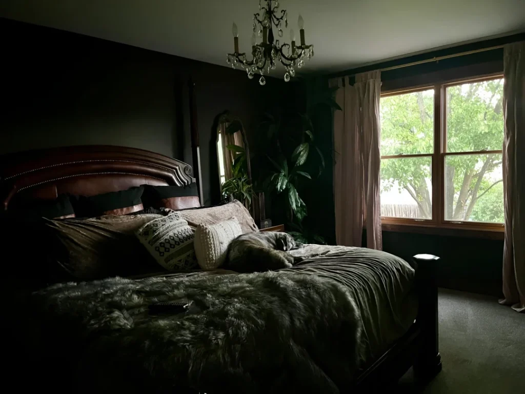 u/beaulogna0 committed to deep emerald or forest green walls that create serious drama. That ornate wood headboard adds traditional elegance, while the crystal chandelier provides sparkle and warm ambient light.