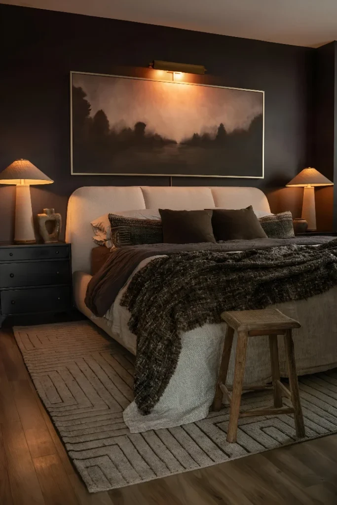 Table lamps with warm glow on each nightstand plus art lighting create multiple light sources—crucial in dark rooms. That wooden stool at the foot adds warmth, and the patterned rug grounds everything. This is high-contrast drama done right.
