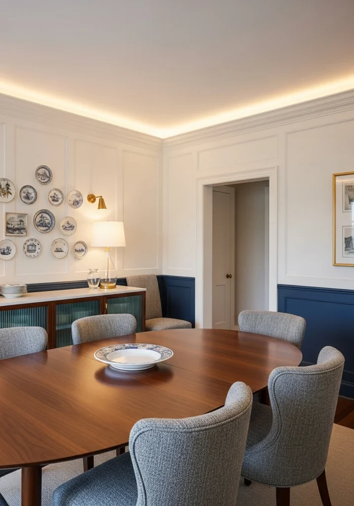 White-painted board-and-batten walls with navy dado creates architectural detail that Ralph Lauren absolutely perfected. The dado line is both traditional and contemporary—it grounds the room while giving it visual structure. A mid-dark walnut oval table feels both substantial and approachable. High-back upholstered chairs in tweed add texture and comfort. A sideboard with fluted-glass fronts provides display and storage. Brass picture lights above curated plates add functional beauty. Soft ambient cove lighting and natural daylight create layers. This architectural approach shows how good bones and classic details create a foundation that supports any entertaining scenario.