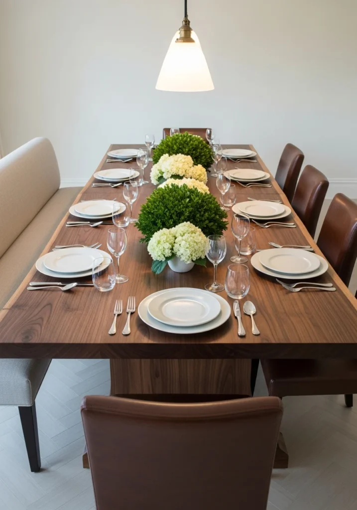 A handmade long walnut table with natural live edge is practically sculpture in itself. Mixed seating of upholstered benches and leather chairs shows confidence—matching everything isn’t necessary when materials are this intentional. A low linear centerpiece of boxwood and white hydrangeas stays simple and organic. Matte porcelain plates and polished silverware create contrast in finish. A warm pendant trio provides functional light without overhead harshness. Pale herringbone flooring adds texture. This host-table approach shows how generous space and natural materials create an inviting environment where people actually want to gather and linger.