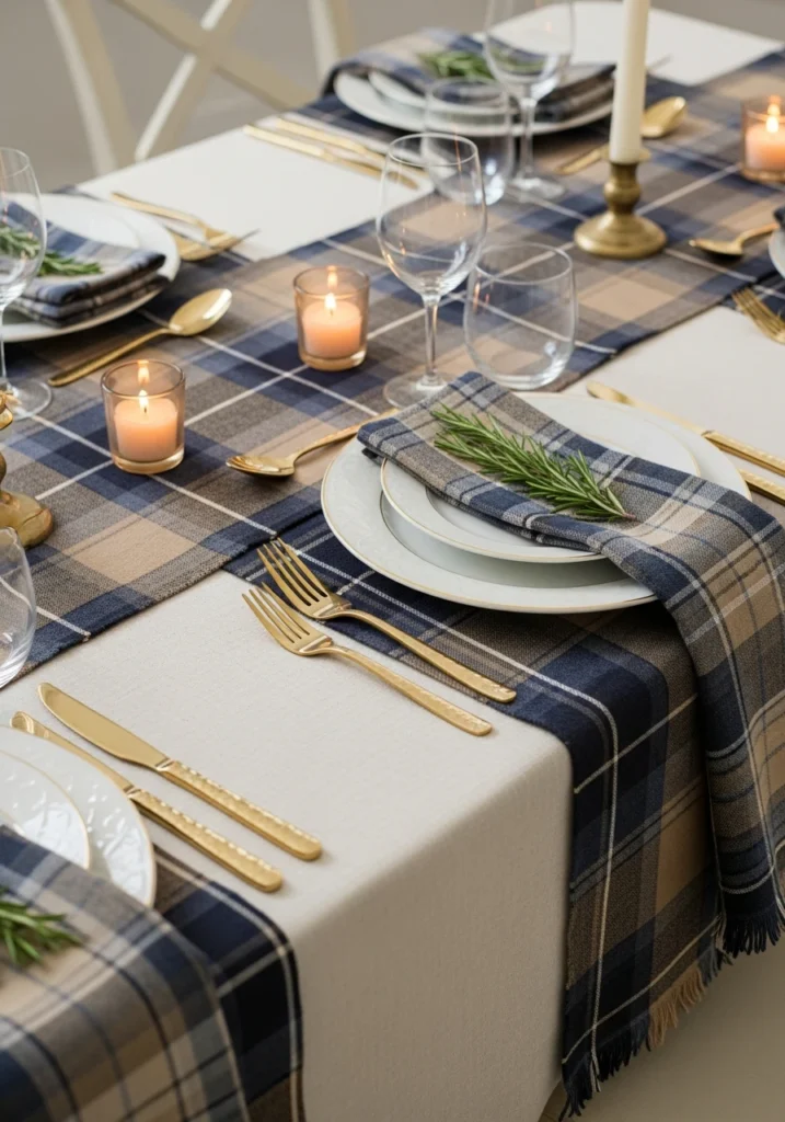 Fine ivory linen on the table is pure Ralph Lauren foundation—simple, elegant, and timeless. Tartan napkins and runner in muted navy and camel add pattern with restraint. Bone-white porcelain plates with subtle gold rim feel refined without being precious. Hammered brass cutlery brings warmth and texture. Small rosemary sprigs at each place add organic freshness. Soft candlelight with warm tone creates the right mood. This place-setting approach proves that when every element is chosen with intention, the overall effect is more than the sum of its parts—it’s genuinely special without feeling fussy.