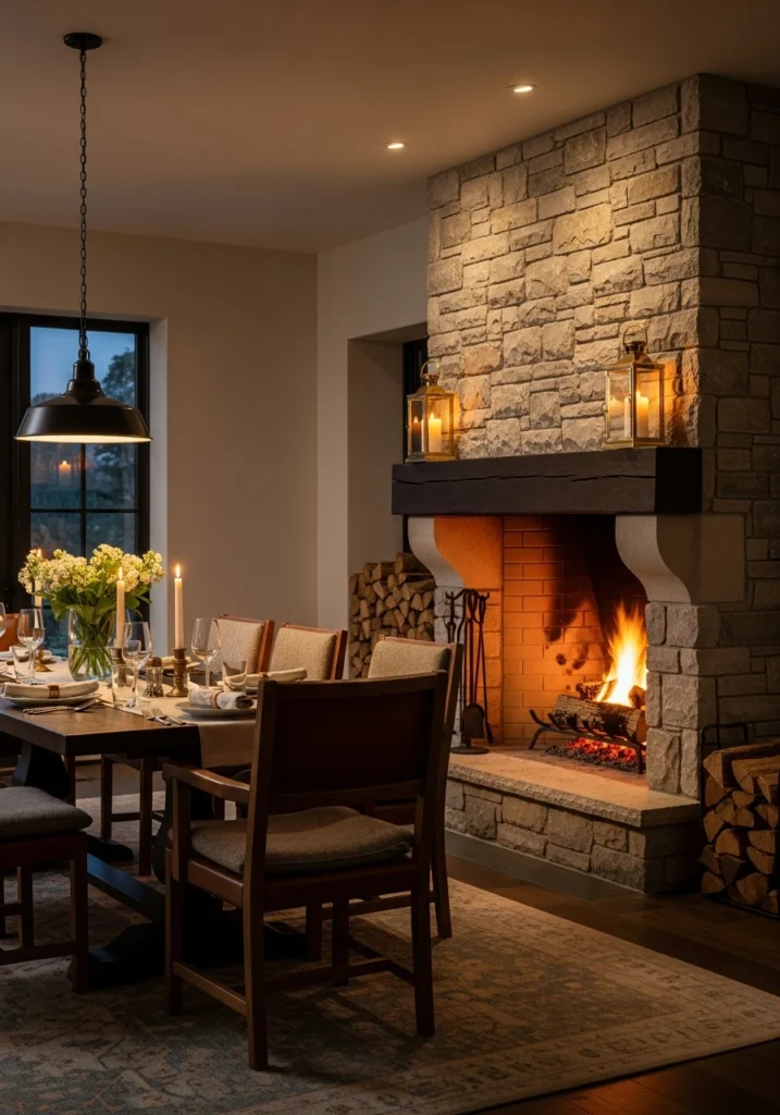 A tall stone fireplace with dark-wood mantel becomes the ambient heart of the dining room. Low brass lanterns and stacked firewood in a neat basket show attention to how functional elements can be styled. Leather side chairs and wool cushions encourage lingering. A pendant dimmed to complement the fire glow rather than compete creates the right balance. An evening composition with warm highlights and soft shadow shows why fireplace-adjacent dining feels so inherently comfortable. This fireplace approach proves that a good focal point beyond just the table transforms dining into something more ritualistic and special.