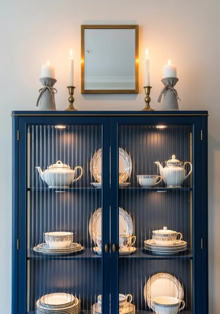 An elegant glass-front china cabinet with navy interior becomes a design moment rather than just storage. Fluted glass doors let you see what’s inside without exposing everything. Curated porcelain arranged thoughtfully shows you’re intentional about display. Linen-wrapped candlesticks on top continue the styling all the way up. A brass-trimmed mirror inset adds light and reflection. Slim spotlights inside the cabinet highlight pattern and texture. This curated-cabinet approach shows how even functional storage can be beautiful—it’s essentially a gallery for things you love.