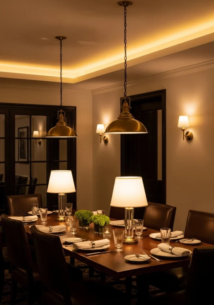Layered lighting in a Ralph Lauren dining room is everything. A combination of pendants, recessed cove, wall sconces, and table lamps—all in warm brass—creates hierarchy and mood. Warm 2700–3000K throughout creates that golden hour feeling even at night. The lighting illuminates a walnut table with leather chairs, folded tailored napkins, and crystal water glasses. A dusk mood with layered pools of warm light creates intimacy without drama. This lighting approach proves that how you illuminate a space matters more than what’s in it—good lighting makes everything look better and feel more intentional.