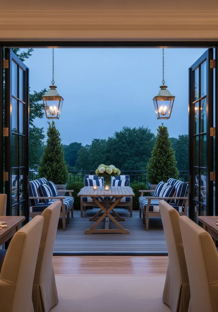 Black-framed French doors opening to a teak terrace with navy-striped cushions and folding oak dining table show Ralph Lauren’s signature indoor-outdoor seamlessness. Brass lanterns and boxwood topiaries anchor the outdoor space. The indoor dining area with linen chairs aligns to the outdoor view, creating flow. An evening blue-hour with warm interior glow makes the transition feel natural. Brass lanterns glow in the gathering dusk. This indoor-outdoor approach shows why Ralph Lauren dining rooms work for actual entertaining—they acknowledge that modern life moves between inside and outside, and good design serves both.