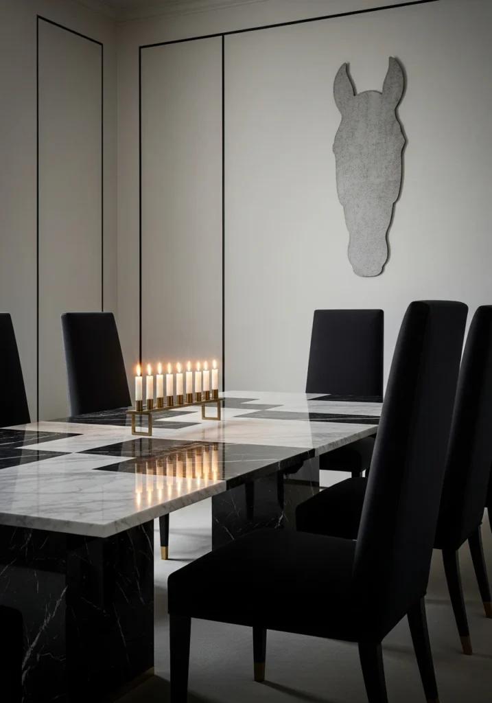 A staggered black-and-white marble tabletop in geometric pattern becomes the room’s biggest design statement. High-back black upholstered chairs with brass legs echo the marble in color and add comfort. A simple large faceless horse silhouette in graphite on a white wall adds personality without being too specific. A low brass candelabra provides intimate light. Pale plaster walls with thin black trim keep everything refined. Dramatic yet restrained lighting creates formality without stuffiness. This formal-marble approach proves that black and white executed at this scale can feel both contemporary and timeless—it’s bold, but never trendy.