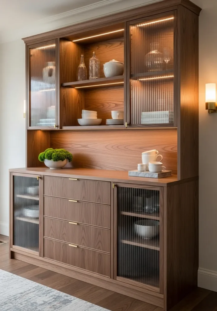 A custom-built walnut buffet with glass-front fluted cabinets becomes both storage and styling canvas. Integrated warm shelf LED lighting highlights what’s displayed without being obvious. Brass hardware ties the piece together. Soft side sconce glow makes the whole setup feel curated. This built-in approach shows how dedicated storage designed specifically for display elevates the entire dining experience—suddenly you have a reason to keep beautiful things out and accessible.