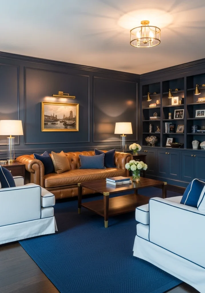 A cognac leather Chesterfield sofa brings warmth against all that navy, while white linen accent chairs with navy piping keep the palette consistent. Walnut coffee tables with brass caps and navy herringbone rugs layer pattern and material.