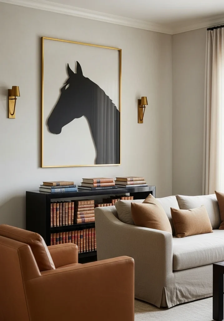 Brass sconces and soft daylight through sheer curtains provide gentle illumination. This works because the equestrian element stays understated—it’s a nod to the heritage without turning your living room into a stable.
