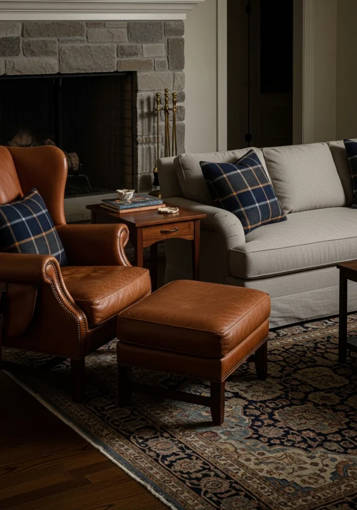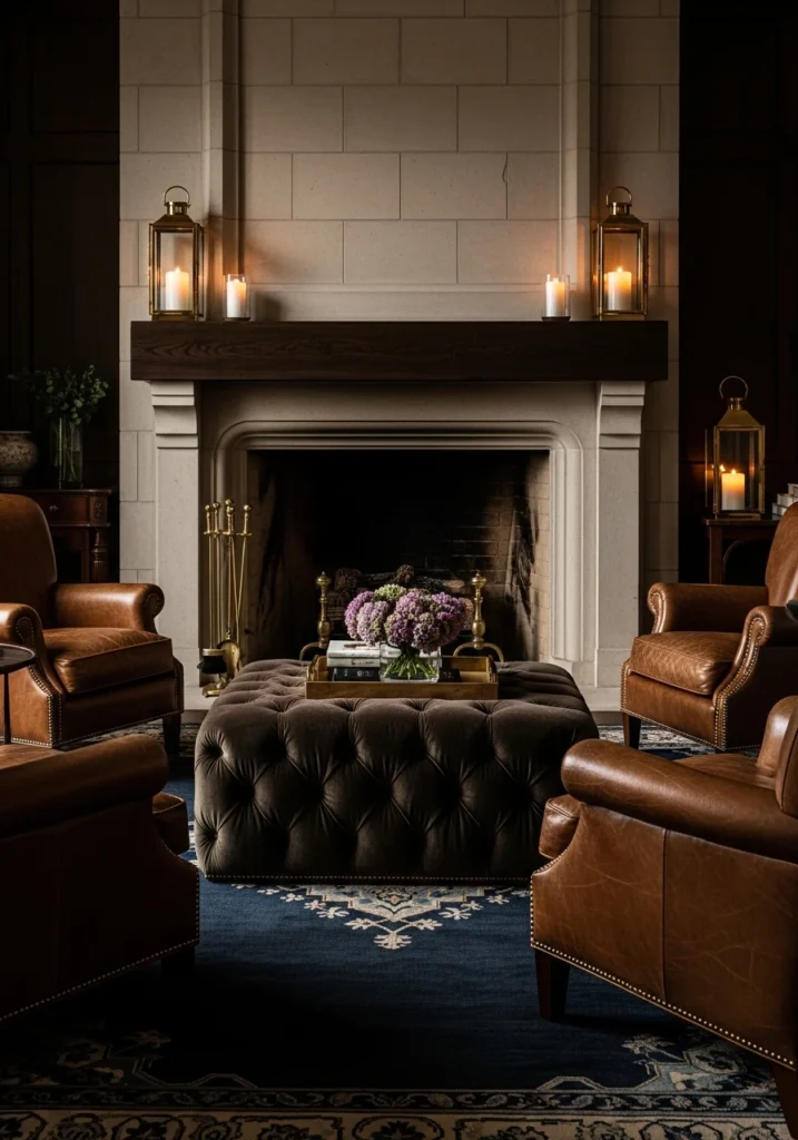 Tall stone fireplaces with dark wood mantels become the room’s anchor. Leather armchairs positioned near the fire create cozy seating zones, and velvet ottomans add comfort.