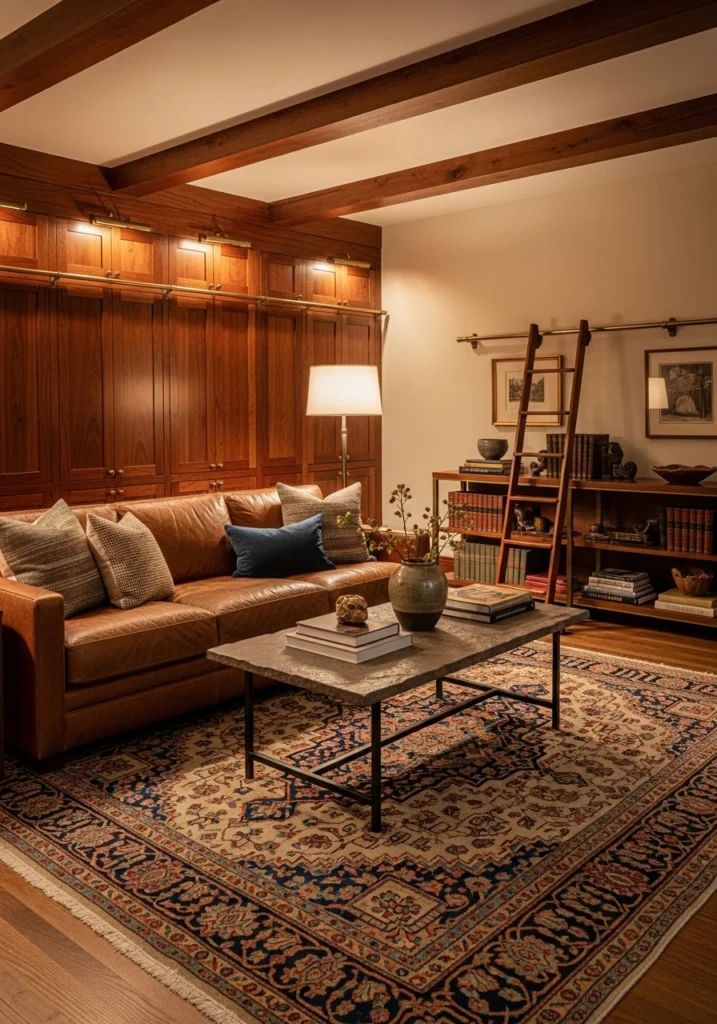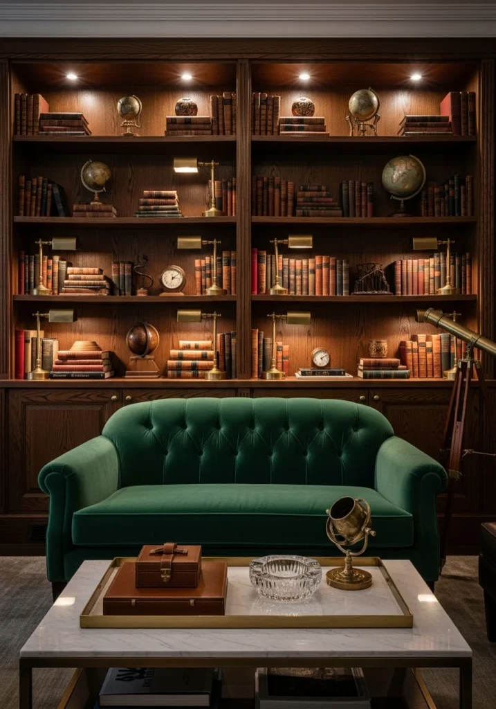Dark-oak wall panels create instant architectural gravitas. Built-in shelving with warm brass library lamps turns walls into functional display that looks collected over time.
