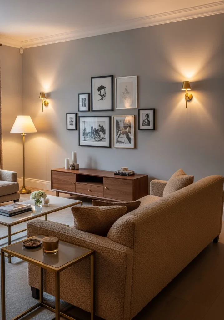 Soft gray walls create a neutral backdrop that lets brass shine. Brass sconces, floor lamps, and brass-trim side tables scatter metallic warmth throughout the space.