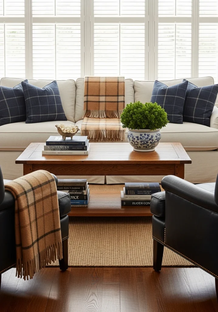 Camel tartan wool throw blankets and navy plaid cushions bring that prep school, equestrian energy. Layering them on ivory linen sofas keeps the plaids from overwhelming.
