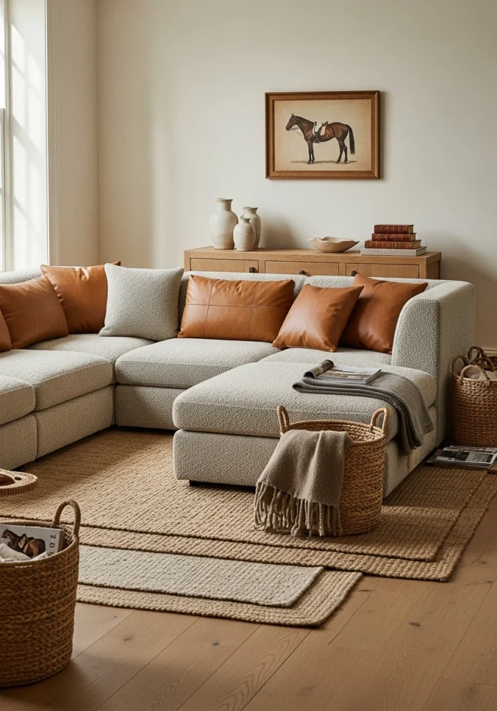 Layering jute and wool rugs creates depth and texture underfoot. Stone boucle sectionals with camel leather cushions mix fabrics beautifully.