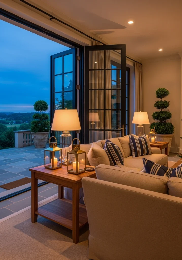 Blue-hour light mixing with warm interior lighting creates magical moments. This works because it extends the living space and shows the aesthetic isn’t just about formal interiors—it adapts to outdoor living too.