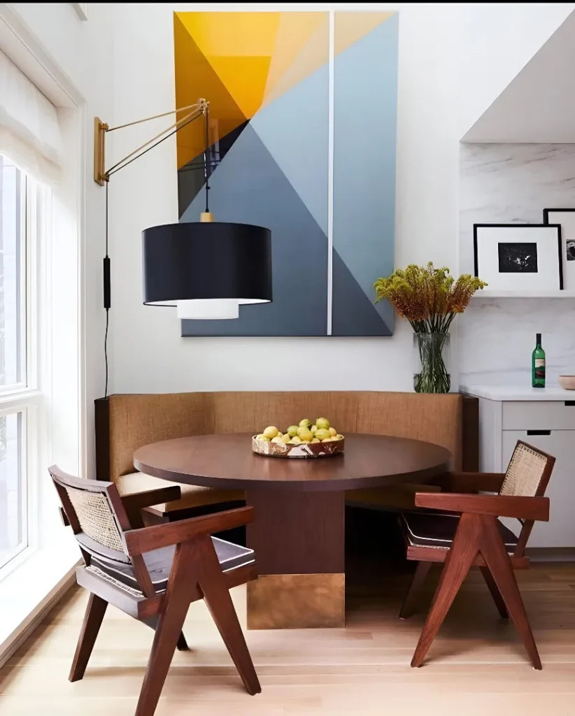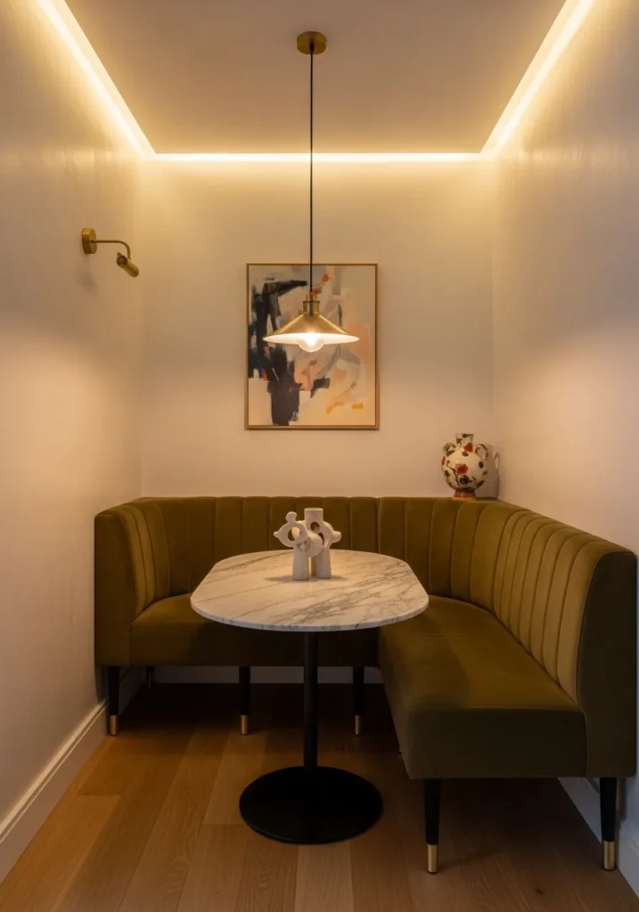 Corner banquettes are one of those smart solutions that just make sense for small dining rooms. The idea here is wrapping seating around a round marble table so you’re using corner space that often goes to waste. Deep-olive velvet for the upholstery brings in richness without feeling too heavy, and adding brass-tipped legs keeps it from looking like built-in furniture—it reads more custom and intentional. Marble tabletops always feel a bit luxurious, but keeping it round means the space stays approachable and easy to move around. The key with this approach is layering in warmth through things like oak parquet flooring and pale plaster walls so all that elegance doesn’t tip into cold or formal. A single piece of abstract art and a sculptural centerpiece give personality without clutter. The real genius is in the lighting—combining a low brass pendant with recessed cove lighting means you get both task light for eating and ambient glow that makes the whole corner feel cozy.