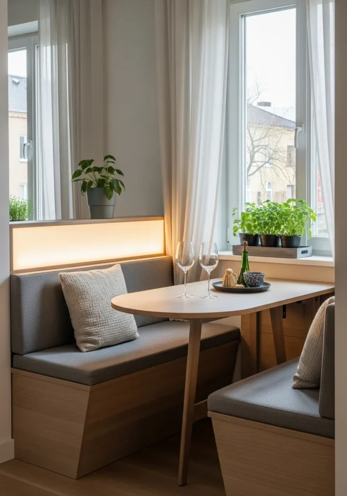 Window-side dining gets even better when you build in a cushioned banquette that takes advantage of all that natural light. The smart part is choosing a foldable table so you’re not locked into a permanent dining footprint—you can collapse it down when you need the space for other things. Floor-to-ceiling sheer curtains do double duty, softening the whole setup during the day while maintaining privacy. But here’s the really clever bit: building LED lightboxes behind the banquette cushions means the spot works just as well at night. Suddenly your bright daytime breakfast nook turns into a cozy, glowing dinner spot. Adding a potted herb tray on the windowsill brings in greenery and fresh scents. The pale oak slats on the bench add texture so it doesn’t just look like plain built-ins. This whole concept proves that window dining areas can actually work around the clock when you think about lighting in layers.