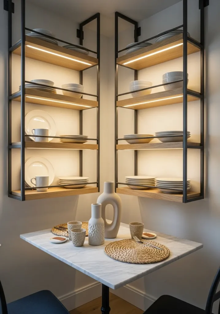 Going vertical with storage is crucial when floor space is tight. The concept of floating steel-and-wood shelves that serve as both display and practical plate storage is brilliant—suddenly you’re using wall space that would otherwise just be blank. Building in recessed lighting to each shelf level means they’re illuminating whatever you display while adding ambient room lighting. A marble-topped bistro table for two keeps the footprint small and the vibe café-chic. Woven placemats and a sculptural vase add organic texture. Balancing cool daylight with warm shelf LEDs creates beautiful layered lighting. This whole approach proves that in small dining rooms, multifunctional elements are essential—everything should do at least two jobs.