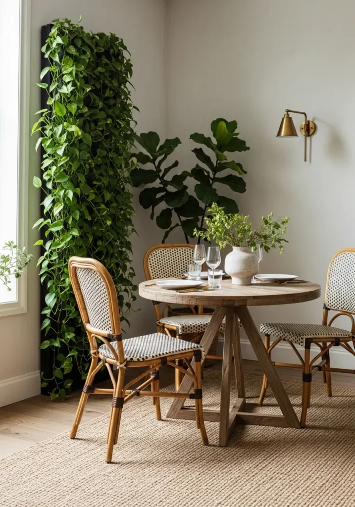 The vertical planter column concept is such a smart way to bring serious greenery into tight dining spaces without sacrificing floor area. Imagine a tall column of trailing philodendron and sculptural fiddle-leaf fig right next to your dining table—it adds life, softens hard edges, and draws the eye upward to make ceilings feel higher. Pairing it with rattan-backed chairs and a round reclaimed-wood table creates a natural, earthy aesthetic that works beautifully with all that green. A natural fiber rug adds more organic texture. The lighting concept layers soft filtered daylight with a single brass wall lamp for evenings. This approach shows how bringing abundant nature indoors can make tight spaces feel alive and welcoming rather than cramped—the green volume does so much to soften everything.