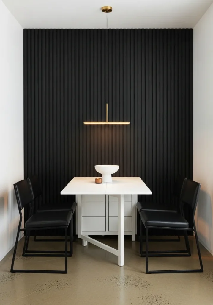 Committing to a strict black-and-white palette might seem risky, but the concept creates such a graphic, gallery-like effect. A matte black slatted wall becomes architectural sculpture that doesn’t need any added décor. The white lacquer fold-out table provides function without permanent visual weight. Black leather cantilever chairs bring in those clean, sculptural lines. A thin brass pendant adds just a touch of warmth without disrupting the high-contrast scheme. White ceramic centerpiece, polished concrete floor—everything reinforces that minimalist, refined aesthetic. This approach works because stripping away color forces you to focus on form, contrast, and quality materials, which makes small spaces feel incredibly sophisticated.