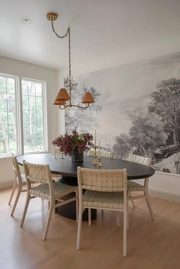 This dining room is basically a lesson in how one statement wall can completely carry a space. u/Halcyon-Haus chose that monochromatic landscape mural with its misty, dreamy quality that’s absolutely stunning—it adds so much depth and makes the room feel way bigger than it actually is. The soft, atmospheric trees and fog create such a serene backdrop that you don’t need much else going on. The black oval dining table grounds the space and provides contrast against all that soft gray imagery. Those woven leather chairs in natural tones are gorgeous—they add warmth and texture that prevents the neutral palette from feeling too cool or stark. The beautiful floral arrangement and tall candlesticks on the table bring in just enough color and life.