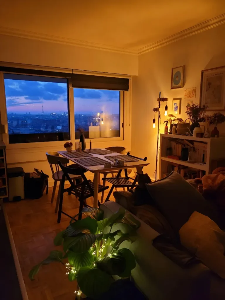 This small dining space totally gets it—when you’re working with limited square footage, good lighting and a killer view make all the difference. u/schraderbrau set up this cozy corner that takes full advantage of those floor-to-ceiling windows with the cityscape beyond. The warm golden glow from the pendant lights creates such an inviting atmosphere, especially at dusk when the city lights start twinkling outside. That simple wood dining table and mismatched chairs keep things feeling casual and collected rather than too formal. The open shelving unit styled with plants, books, and decor does double duty as storage and a room divider without blocking light or views. The way plants are incorporated at different levels—on the windowsill, on the shelves, tucked in corners—brings so much life to the space.